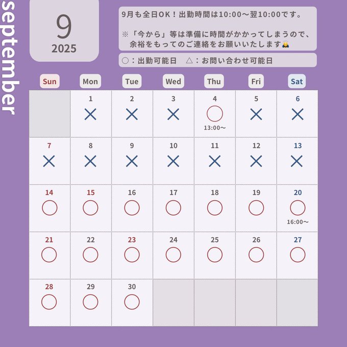 2025/09/01 【柊羽】9月出勤表 こんにちは、しゅうです! 9月もよろしくですぅ 直近の🈳は9/4(木) 13:00〜 のみとなっております 9/14(日)以降はまだまだ空いてます! ※❌の日でも日中や深夜など、空いてる時間帯もあります! お気軽にお問い合わせください☺️ tagPlaceholderカテゴリ: 出勤表, 柊羽