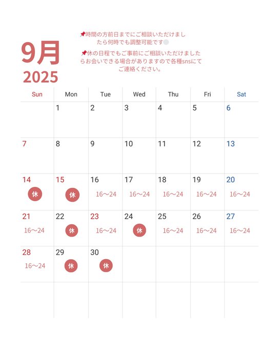 2025/09/14 【あいら】9月出勤表 出勤が16日からになります。 休になっている日、基本時間の16〜24時以外の時間でもご事前にご相談いただけましたら調整可能です🙆♂️ これから皆様にお会いできる日を楽しみにお待ちしております! tagPlaceholderカテゴリ: あいら