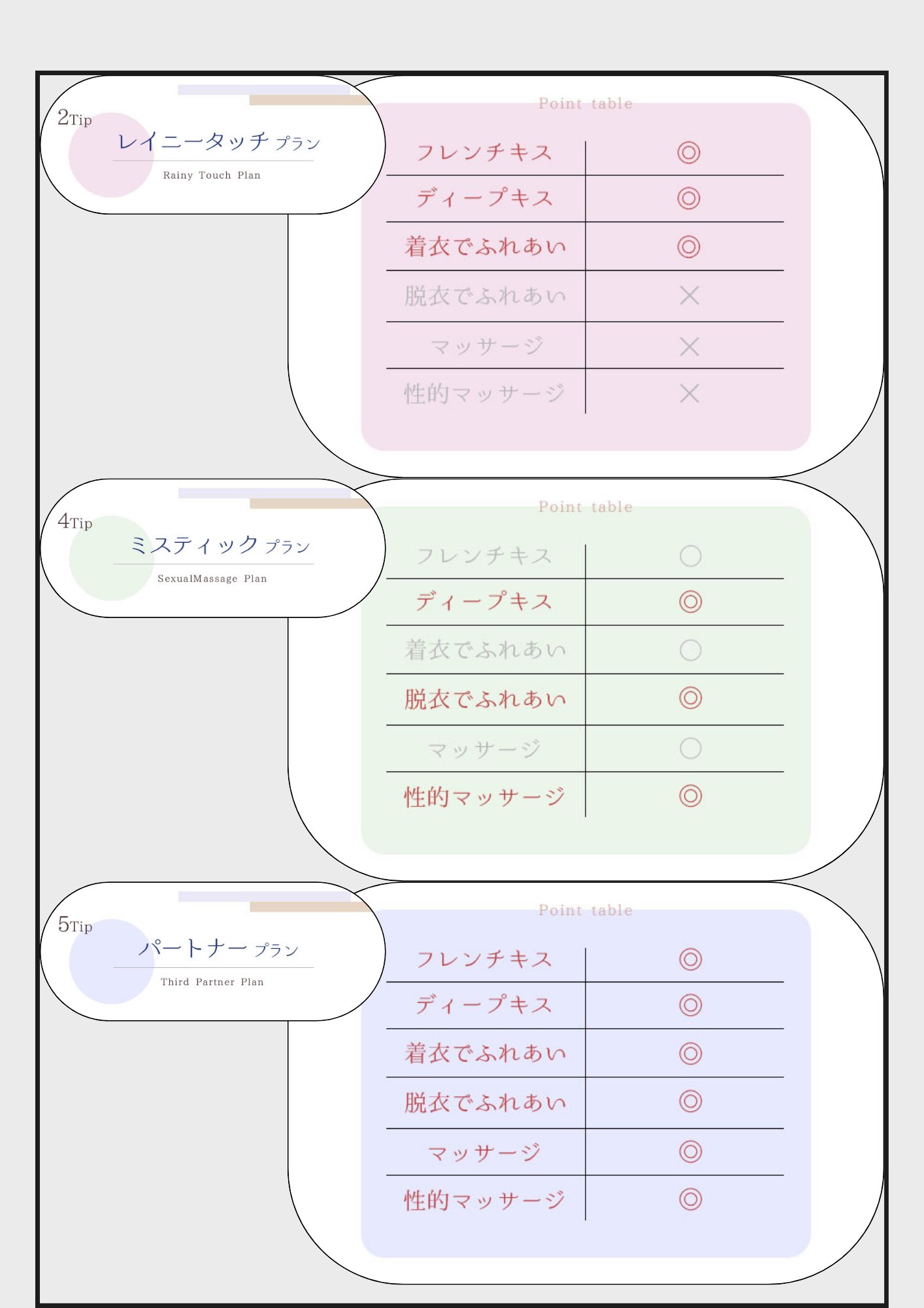 2025/09/18 【柊羽】めちゃくちゃ聞かれるので説明!! 卒業期間の特別予約の3つ ・レイニータッチプラン ・ミスティックプラン ・パートナープラン 名前だけじゃ判断難しいよね なので分かりやすく言うと、 ・デート ・性感 ・8時間以上のロング ってイメージです! 詳細は画像を参考にしてみて〜 tagPlaceholderカテゴリ: 柊羽
