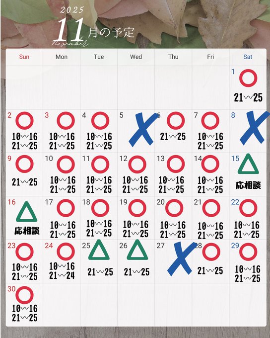 2025/11/04 【しとね】11月出勤表 遅れちゃいました🍁🍂 11月の出勤予定表になります🌧️ 今月はモリモリ頑張って出勤してます! 時間設定してますが、お早めに相談していただければ表記の時間外も対応できる場合がございますので、お気軽にDM下さいね💭ྀི🤍 ⛅️予定は急遽変更になる場合がありますので、都度お知らせいたします⛅️ tagPlaceholderカテゴリ: しとね
