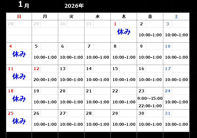 【出勤予定】 相変わらず、全然カッコよくない予定表ですが、、笑 効率重視で。。。 XのプロフィールからLINEまで飛んでご連絡いただければ幸いです🥺 さっきカラオケで特撮、V系、ボカロ、アニソンを歌ってスッキリです✌ 12月30・31日は旭川にいますので、もしタイミングあえば👀