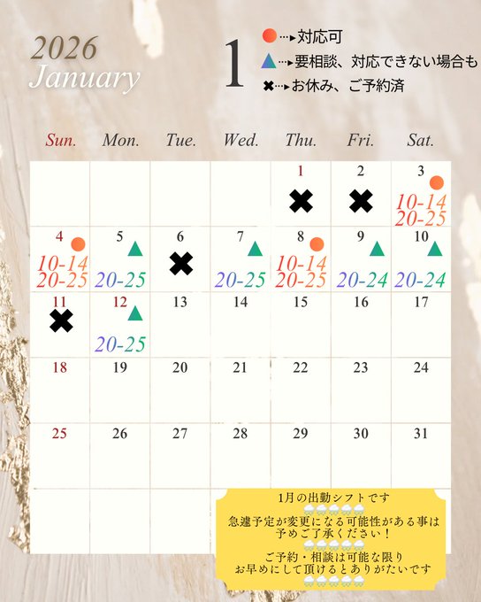 2026/01/04 【しとね】1月出勤表 🎍1月の出勤表提出まる🎍 2026年もよろしくお願い致しますね! 前半部分になります🥺🥺 後半部や予約等により適宜スケジュール更新して参ります お早めにご相談して頂ければ表示時間外でもスケジュール調整致しますので お気軽に話しかけてきてくださいね〜!! tagPlaceholderカテゴリ: しとね