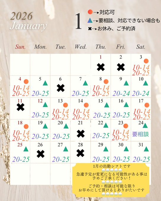 2026/01/07 【しとね】1月出勤表修正版 1月の出勤表追加修正版まる お早めにご相談して頂ければ表示時間外でもスケジュール調整致しますので お気軽に話しかけてきてくださいね〜!! 今年の初めは僕と遊びましょ〜ྀི tagPlaceholderカテゴリ: 出勤表, しとね