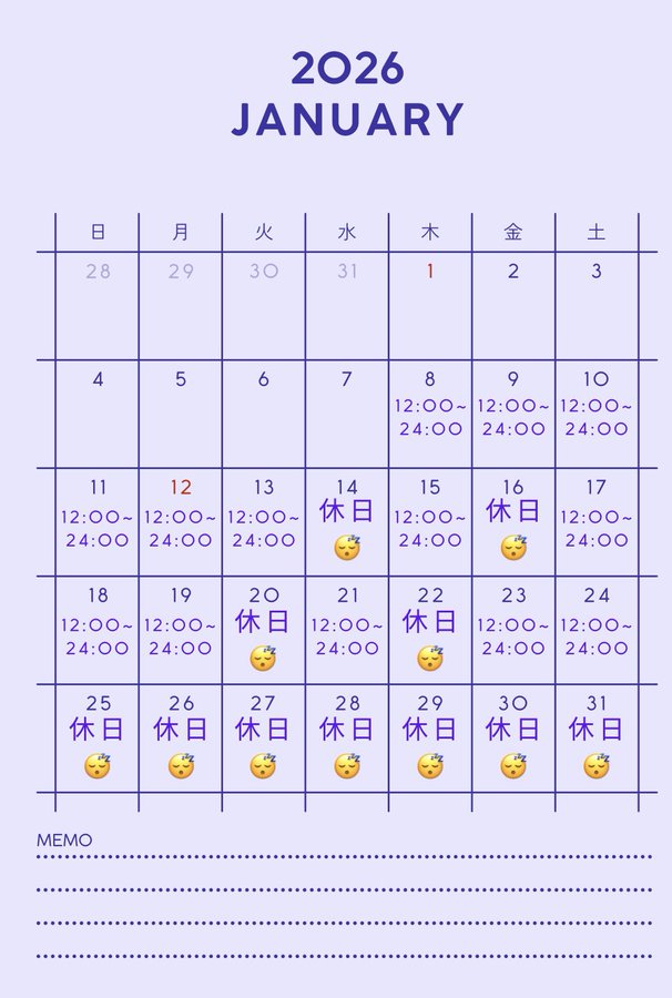 2026/01/08 【かず】1月出勤表 みんなお久しぶり〜 1月の予定表だよー! 1月頑張って行きます! 今年の抱負は、「自分含めみんなを幸せにする!」です! これからまたよろしくね tagPlaceholderカテゴリ: 出勤表, かず