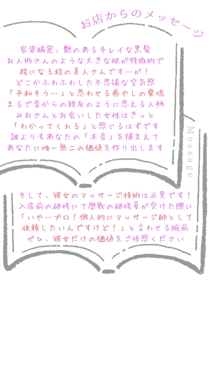 紹介文やXの投稿を見て、女性の女性風俗ってどんな感じなのかなと以前より思っっていたのと、タイミングが合ったのでお会いすることにしました。 お顔を出していない方なので、写真の雰囲気から、かってに色々想像していましたが、実際にお会いして、小さくて、可愛い!お人形さんみたい、髪すごくきれい!可愛い、そして、可愛いらしい笑顔と単純に思いました。 ご飯を食べながら、色々、お話して、私が率直に気になることを質問しても、嫌がることなく率直に答えてくれて、とても、素直な良い方でした。 多趣味で、私の趣味と重なる部分もあって、楽しい時間を過ごせました。見た目から、あまり、ご飯をたくさん食べる方じゃないのかなと思ってましたが、美味しそうに完食していたので、意外と食べるんだとびっくりしました。 私の服装が、ワンピースと伝えていたので、あわせて、ワンピースを着てきてくれて、そのワンピース姿も夏らしく爽やかでとても似合っていました。 私は、女性を性の対象としては見てませんが、個人として、みおさんは、話しやすくて「素直な良い方」と思いました。 次回は、一緒にパンケーキ食べようね。